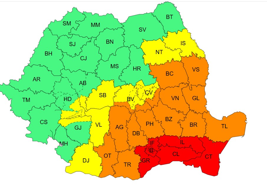 În județele Constanța, Călărași, Ialomița, Giurgiu, Ilfov și în municipiul București va ploua torențial și abundent, izolat se vor semnala descărcări electrice, iar în intervale scurte de timp sau prin acumulare vor fi cantități de apă de 80…100 și izolat 120…140 l/mp.