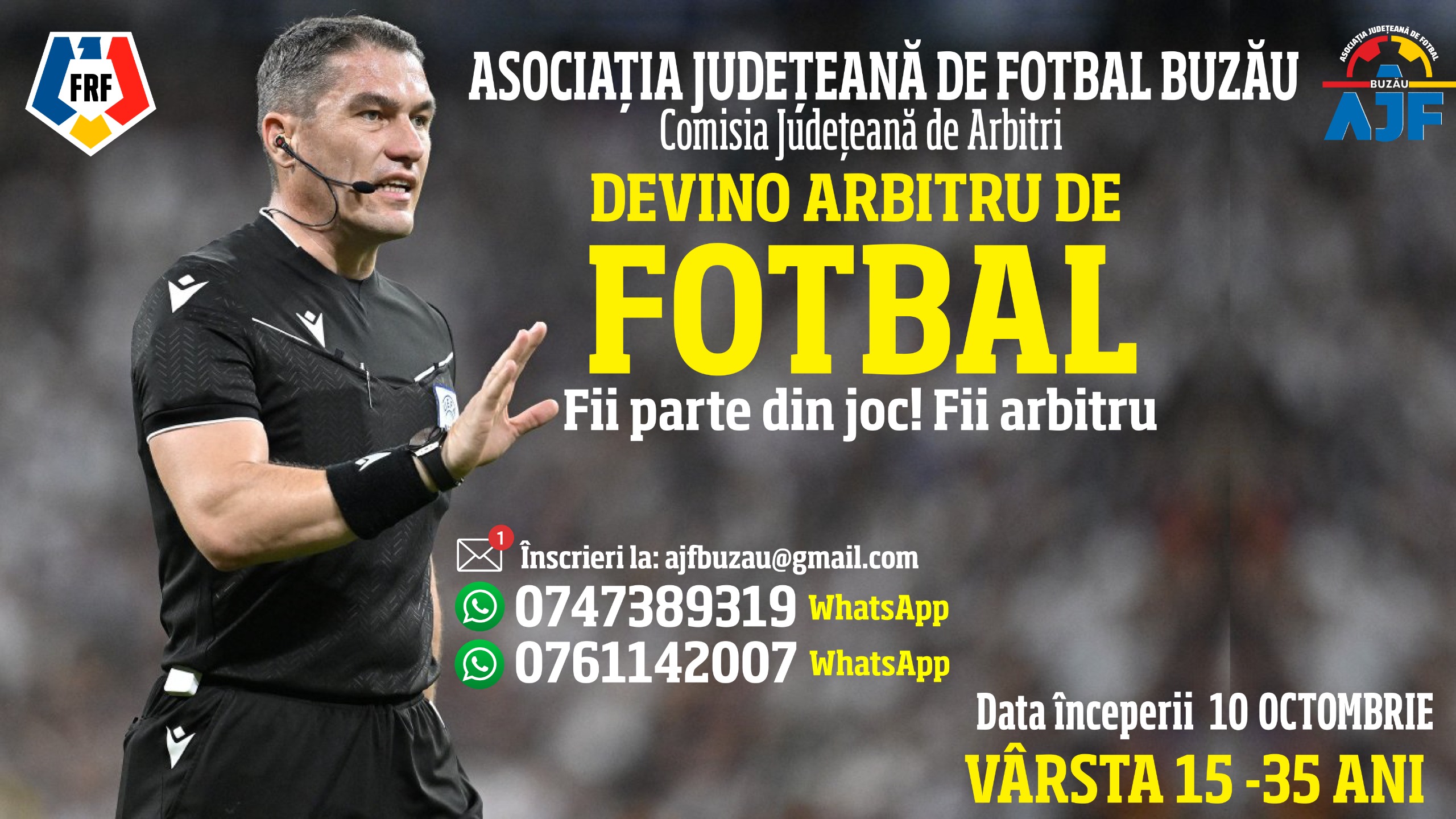 Pe 10 OCTOMBRIE, Comisia Județeană de Arbitri Buzău își va deschide cursurile pentru tinerii și tinerele pasionați de fotbal. Lectori ai cursurilor vor fi arbitrii noștri din loturile naționale.