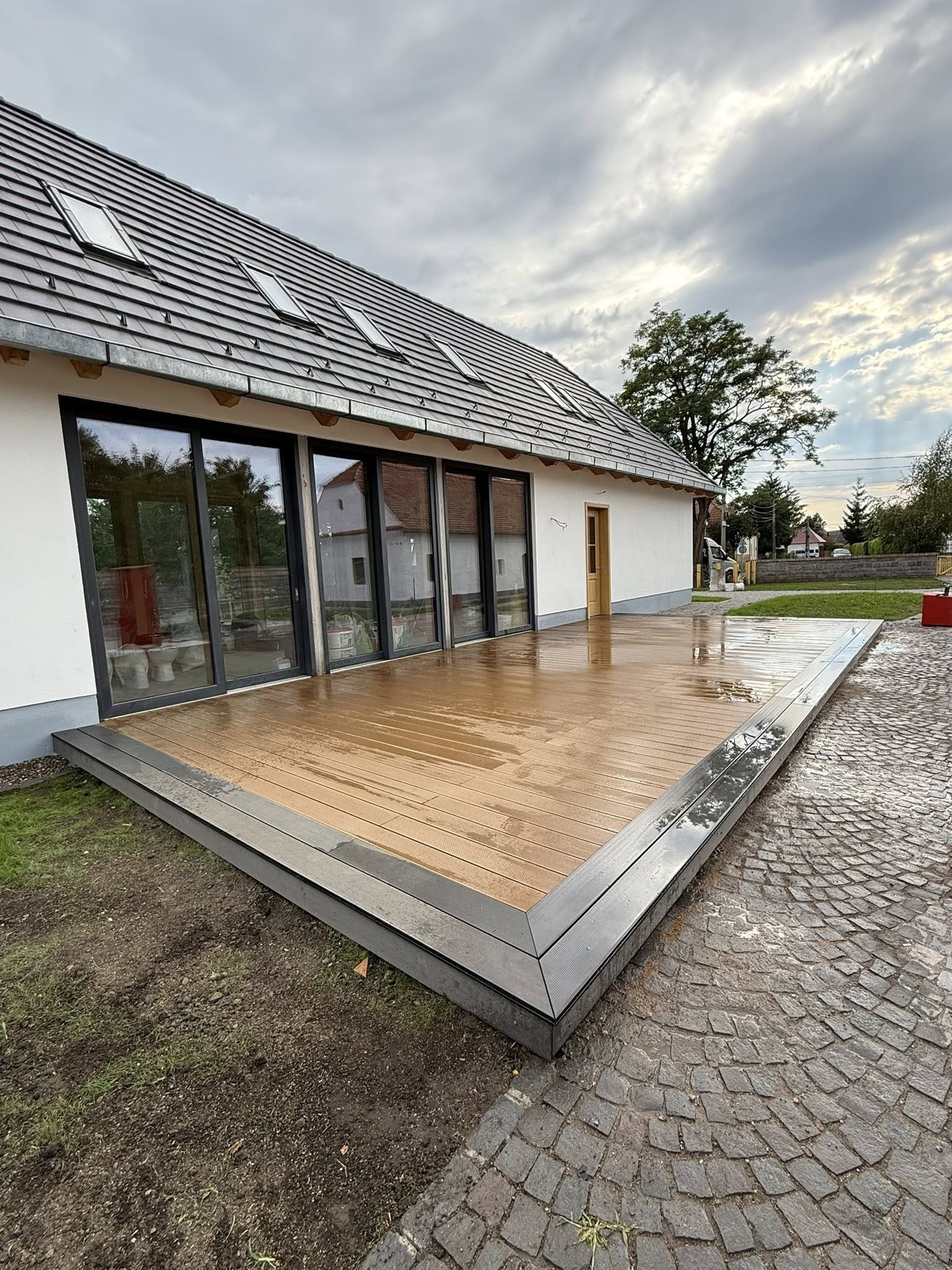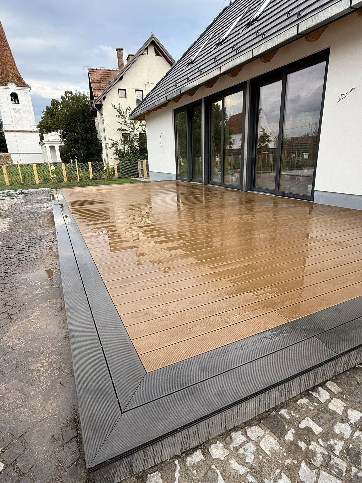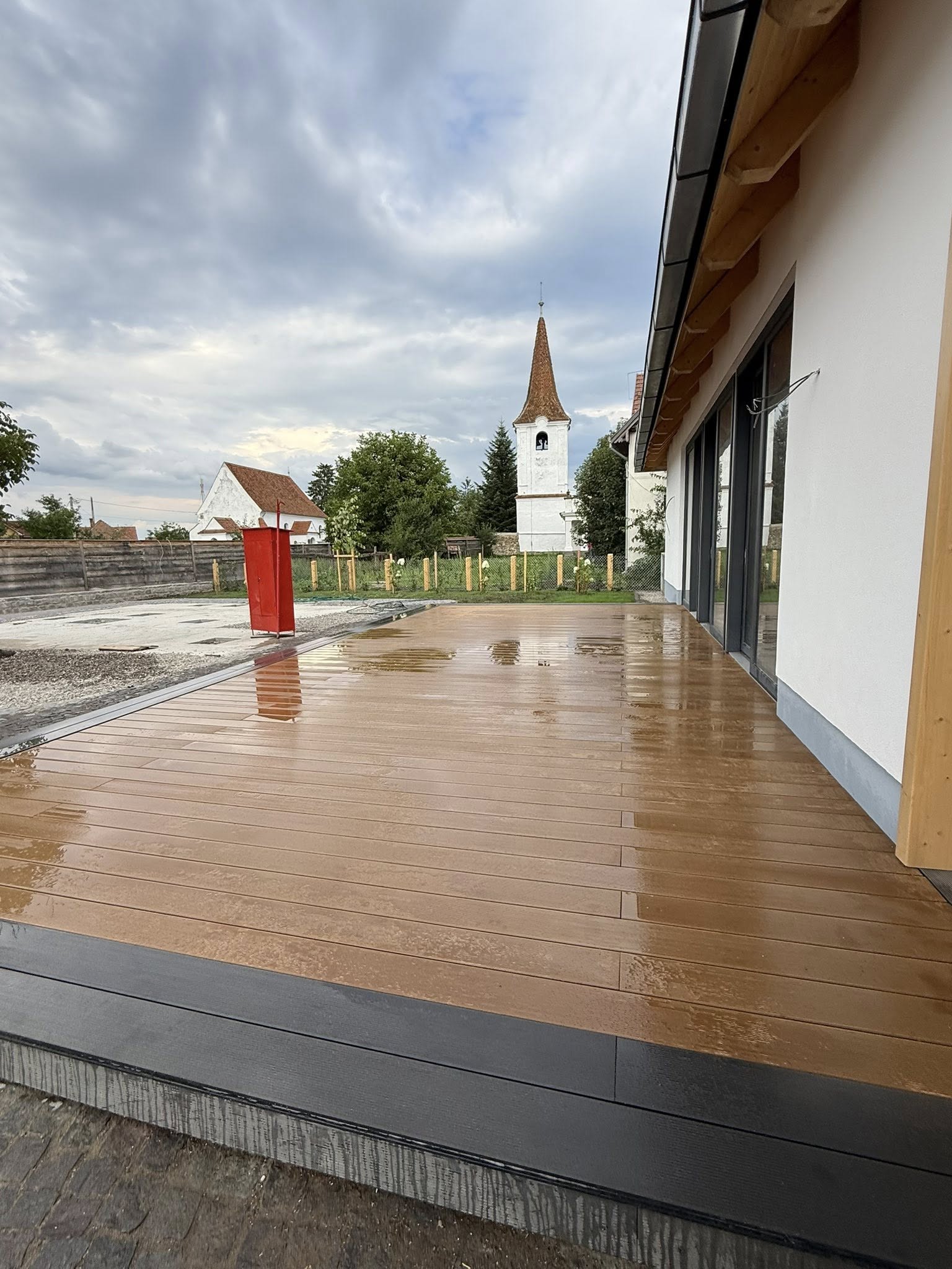 - Lambriuri de exterior: Fațadele placate cu WPC adaugă un plus de rafinament arhitecturii moderne și protejează clădirea.