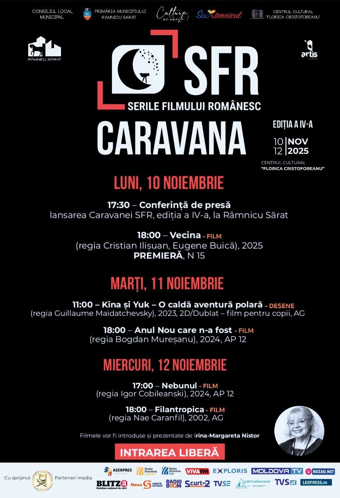 Caravana Serile Filmului Românesc (SFR) revine în forță la Râmnicu Sărat pentru cea de-a IV-a ediție, transformând orașul într-o capitală a cinematografiei naționale între 10 și 12 noiembrie 2025. Timp de trei zile, publicul este invitat la Centrul Cultural „Florica Cristoforeanu” pentru a se bucura de o selecție de filme noi și clasice, toate cu intrare liberă. Evenimentul va fi însuflețit de prezența excepțională a criticului de film Irina-Margareta Nistor, care va introduce și prezenta fiecare proiecție.
