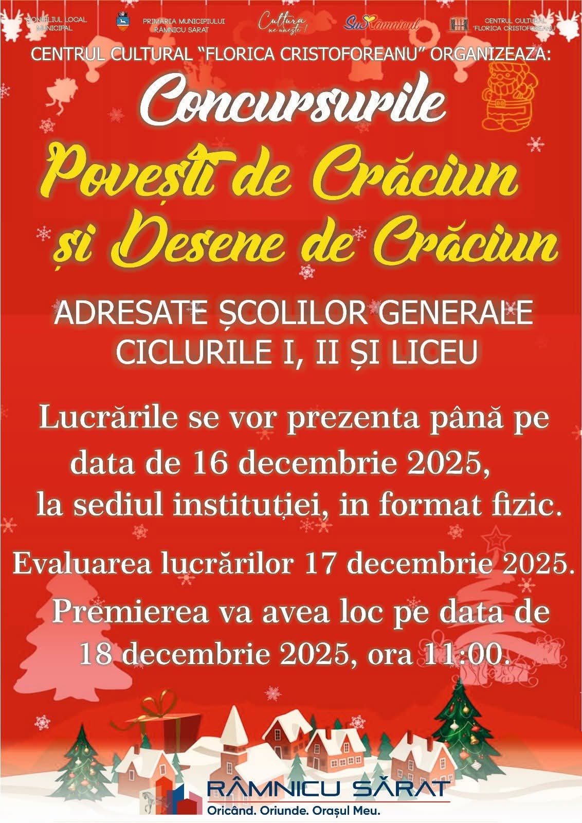 Spiritul sărbătorilor de iarnă prinde viață la Râmnicu Sărat! Centrul Cultural „Florica Cristoforeanu” invită elevii să-și exprime creativitatea și să celebreze magia sezonului prin două competiții tematice speciale: Concursul „Povești de Crăciun” și Concursul „Desene de Crăciun”