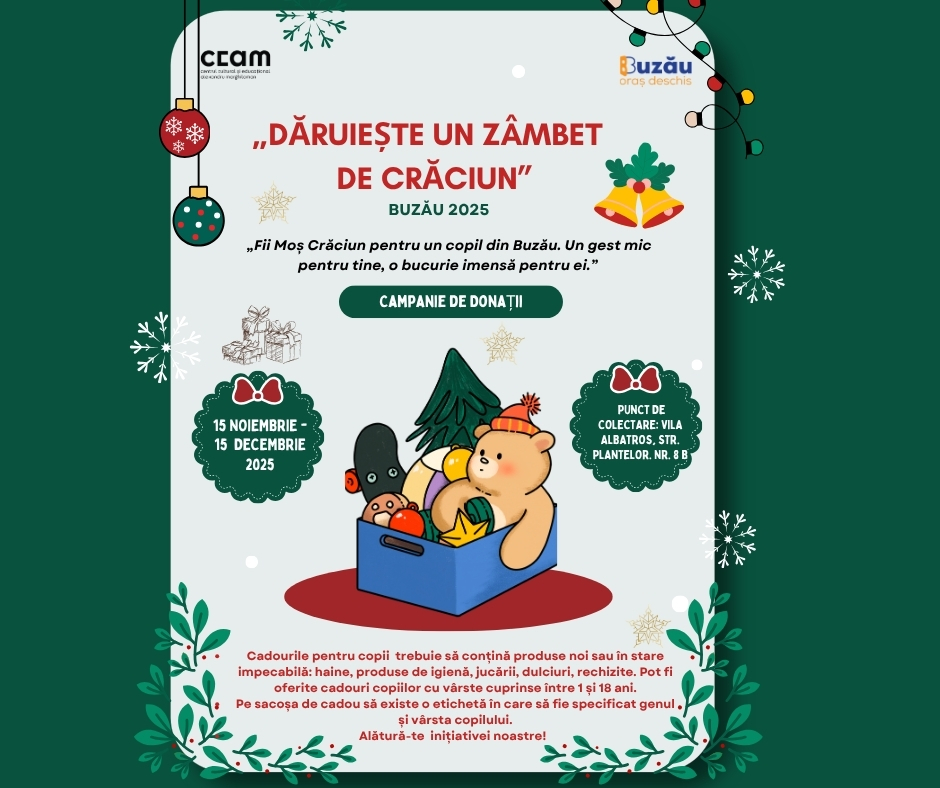 În perioada 15 noiembrie – 15 decembrie se lansează campania „Dăruiește un zâmbet de Crăciun” 2025, a Centrului Cultural și Educațional „Alexandru Marghiloman” creată cu ocazia sărbătorilor de iarnă pentru a răspândi veselie, voie bună și încredere copiilor din mediile defavorizate, din județul Buzău.