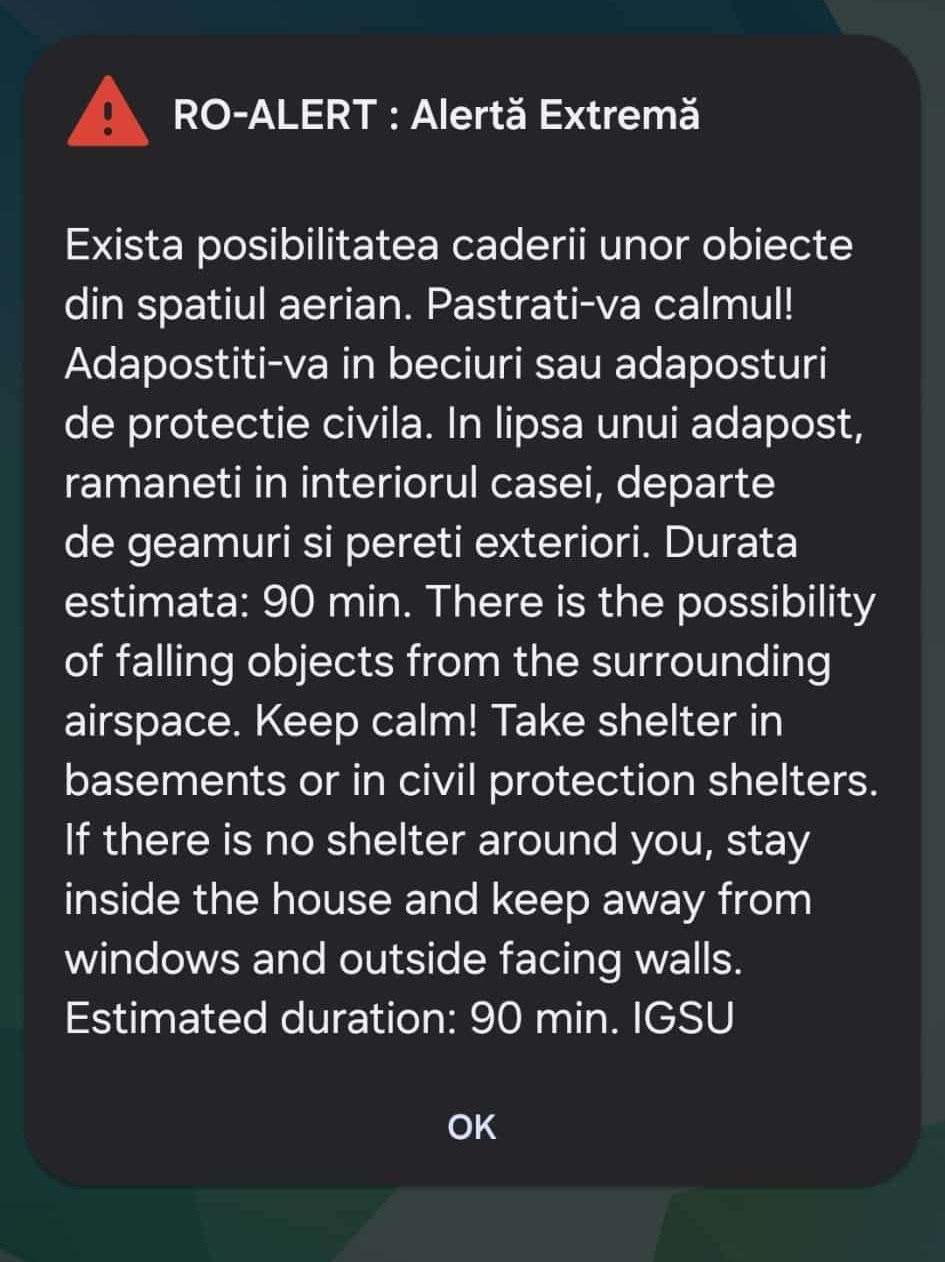 Purtătorul de cuvânt al Ministerului Apărării, colonelul Corneliu Pavel, a declarat că ținta aeriană a rămas deasupra teritoriului național pentru mai mult de 40 de minute, iar piloții aeronavelor de luptă aveau autorizația de a o doborî. În paralel, Inspectoratul General pentru Situații de Urgență (IGSU) a precizat că mesajele RO-Alert au avut un rol preventiv, pentru a informa populația despre un potențial risc și a solicita adoptarea unor măsuri minime de protecție.