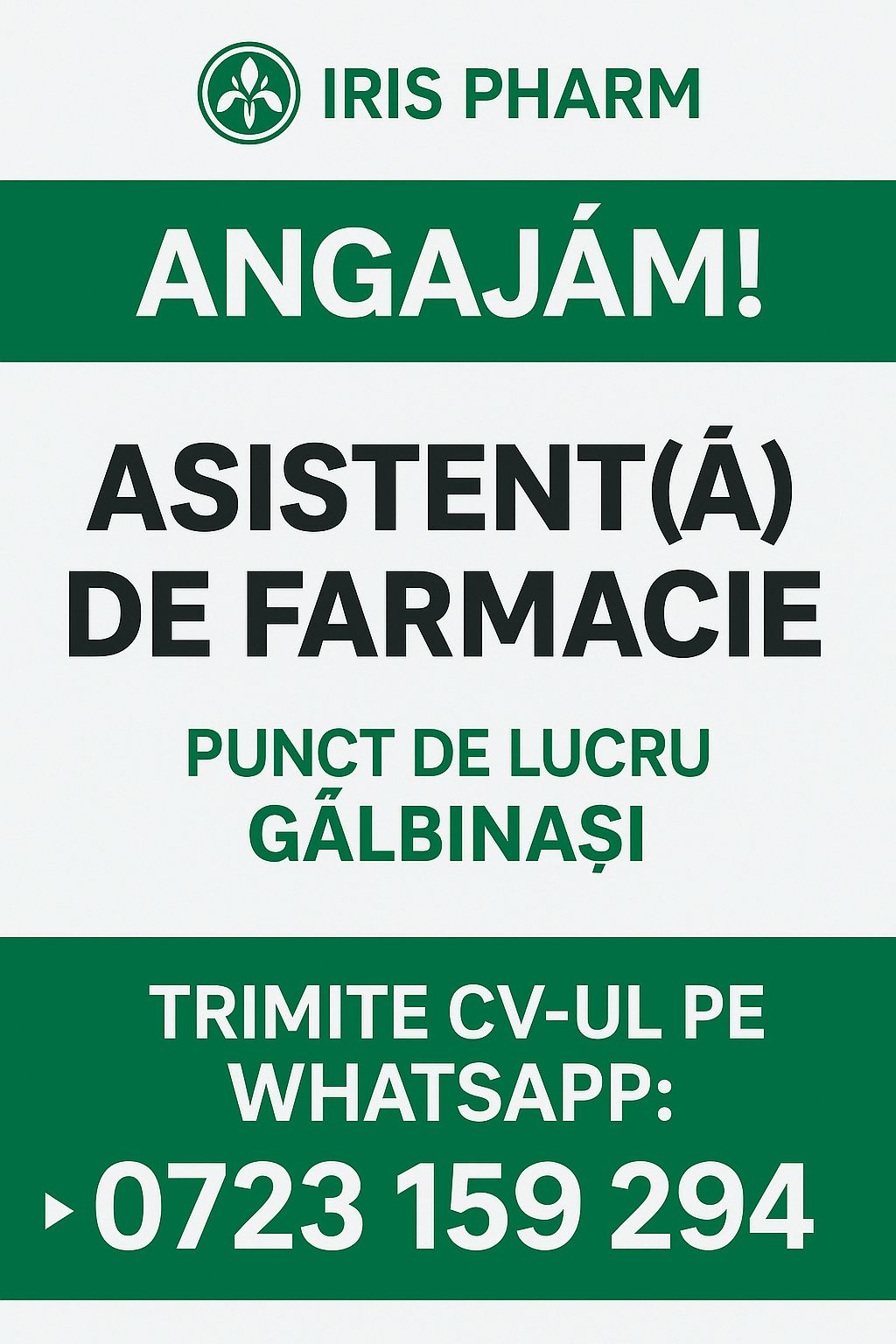 Compania Iris Pharm anunță că angajează un Asistent sau o Asistentă de Farmacie pentru punctul de lucru din localitatea Gălbinași.
