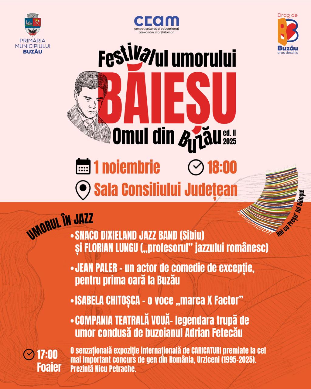Buzăul se pregătește să celebreze umorul de calitate la a doua ediție a Festivalului de Umor „Băieșu – Omul din Buzău”, un eveniment organizat de Primăria Municipiului Buzău și Centrul Cultural și Educațional „Alexandru Marghiloman” (CCAM). Evenimentul va avea loc vineri, 1 noiembrie, la Sala Consiliului Județean, promițând o seară memorabilă sub genericul „Umorul în Jazz”.