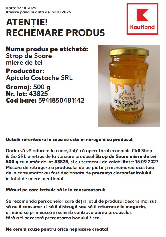 Kaufland a anunțat retragerea de la vânzare a produsului „Strop de Soare – miere de tei”, produs de Apicola Costache SRL, comercializat în borcane de 500 g, având numărul de lot 43825 și codul de bare 5941850481142. Termenul de valabilitate al lotului vizat este 15.09.2027.