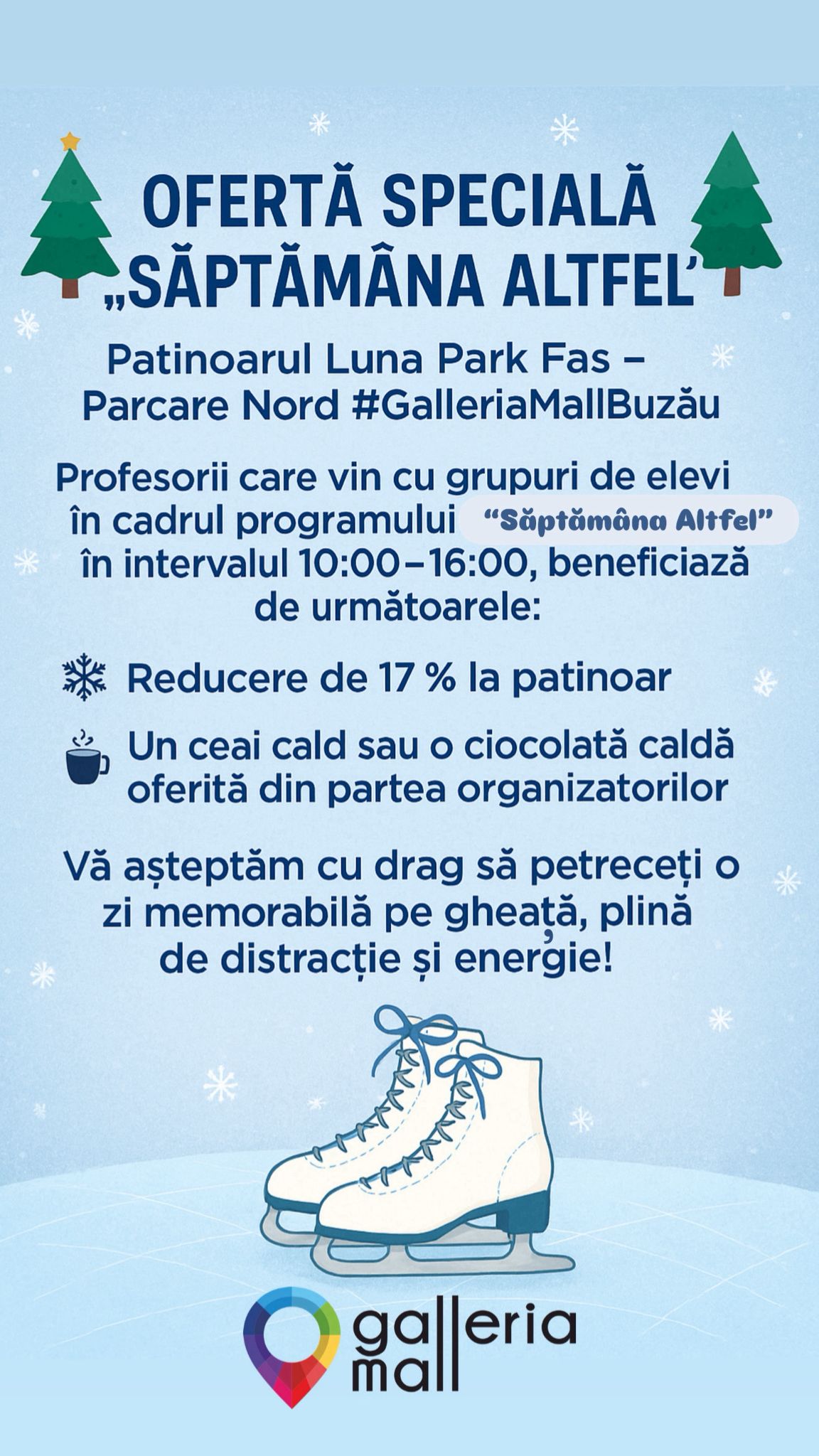 Patinoarul de la Galeria Mall se alătură programului național „Săptămâna Altfel” cu o invitație specială adresată unităților de învățământ. Inițiativa urmărește să ofere elevilor o alternativă educativă și recreativă, încurajând mișcarea și socializarea într-un cadru plin de energie și distracție.