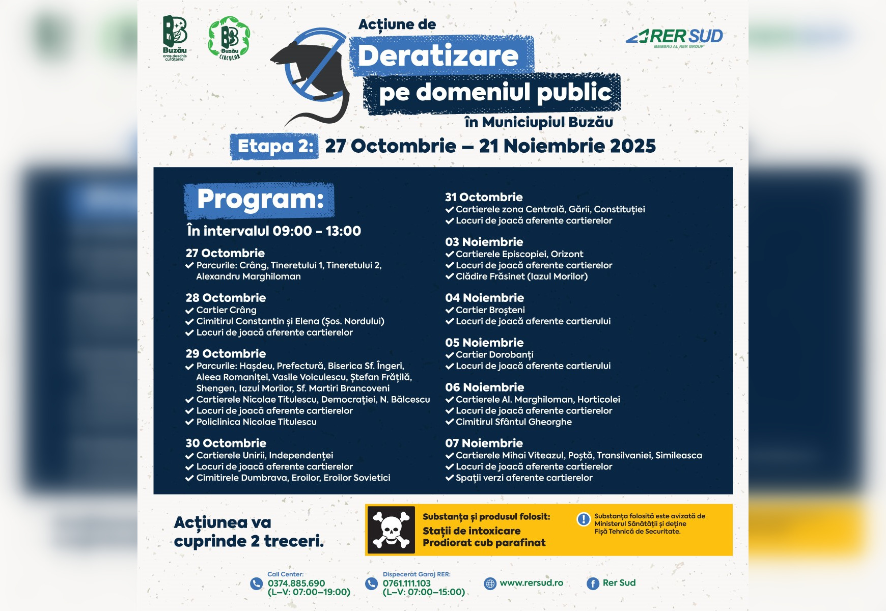 - Primăria Buzău, prin RER SUD în calitate de unic operator de pe raza municipiului Buzău pentru prestarea serviciului de dezinfecție, dezinsecție și deratizare, desfășoară a doua etapă de deratizare pe domeniul public din municipiul Buzău, în perioada 27 octombrie – 21 noiembrie 2025