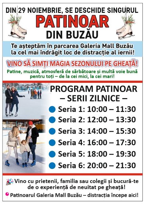 Începând cu data de 29 noiembrie, buzoienii, de la cei mici la cei mari, sunt așteptați să se bucure de magia iernii pe gheață. Singurul patinoar din oraș își deschide porțile în locația deja cunoscută, în parcarea centrului comercial Galeria Mall, devenind cel mai îndrăgit loc de distracție al sezonului rece.