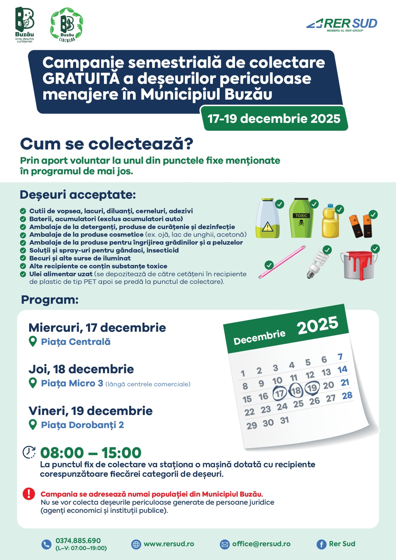 Toți cetățenii din Municipiul Buzău pot preda deșeurile periculoase menajere în zilele de 17, 18, 19 Decembrie, la unul din cele 3 puncte fixe temporar amenajate, unde va staționa în intervalul orar 08.00 -15:00 o autoutilitară a companiei RER SUD, distinct inscripționată, dotată cu recipiente corespunzătoare pentru fiecare categorie de deșeu.
